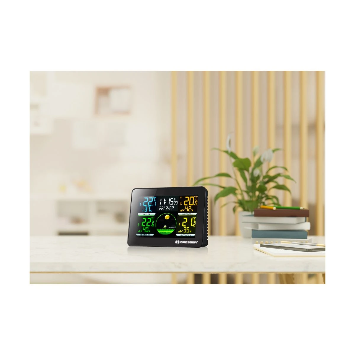 Le Thermomètre Hygromètre Quadro NLX de Bresser est facile à installer et à utiliser. Les capteurs extérieurs peuvent être fixés à des endroits pratiques à l’aide des supports de fixation fournis, tandis que la station de base peut être posée sur une table ou accrochée au mur grâce au support rabattable et au trou pour monture murale. L’écran LCD clair et lisible affiche les résultats de mesure de manière facile à comprendre, tandis que les boutons de commande simples vous permettent de naviguer facilement dans les différentes fonctionnalités de l’appareil.